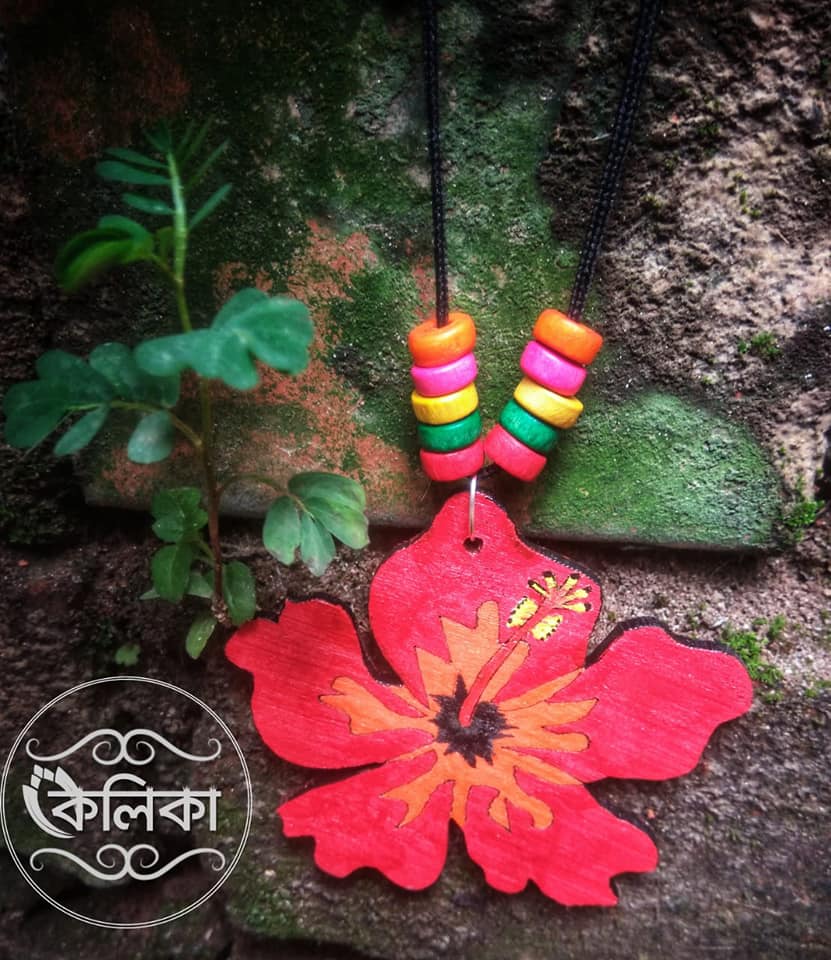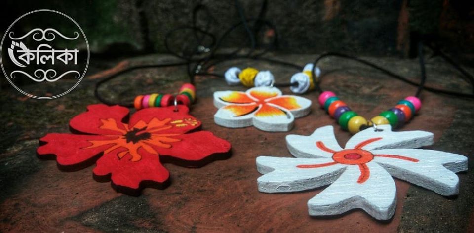 সম্পূর্ণ হাতের তৈরি কাঠের বাহারি গয়না (মালা ও কানের দুল)।